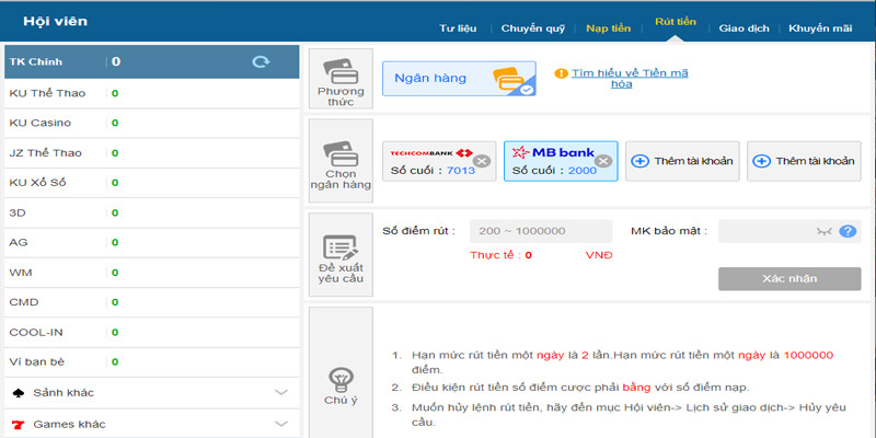 Gửi lệnh rút tiền kubet kucasino : Truy cập vào mục quản lý tài khoản, chọn chức năng rút tiền và điền đầy đủ thông tin yêu cầu, bao gồm số tiền và tài khoản nhận.