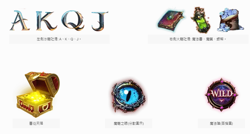 Biểu tượng tỷ lệ cược [sách ma thuật, lọ thuốc ma thuật, đồng bạc] được con rồng lửa ở bên phải nhổ ra